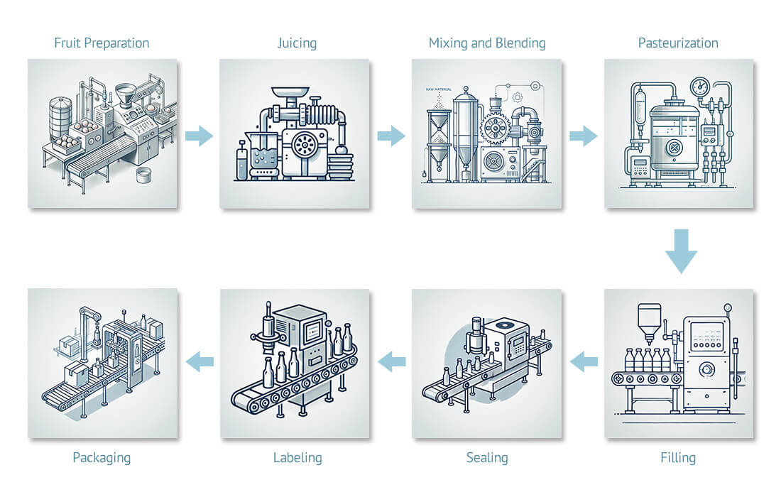 | Juice Drinks | Pasteurizer, hot filling machine, homogenizer | Hot filling, homogenization | PET bottles, glass bottles, cartons |