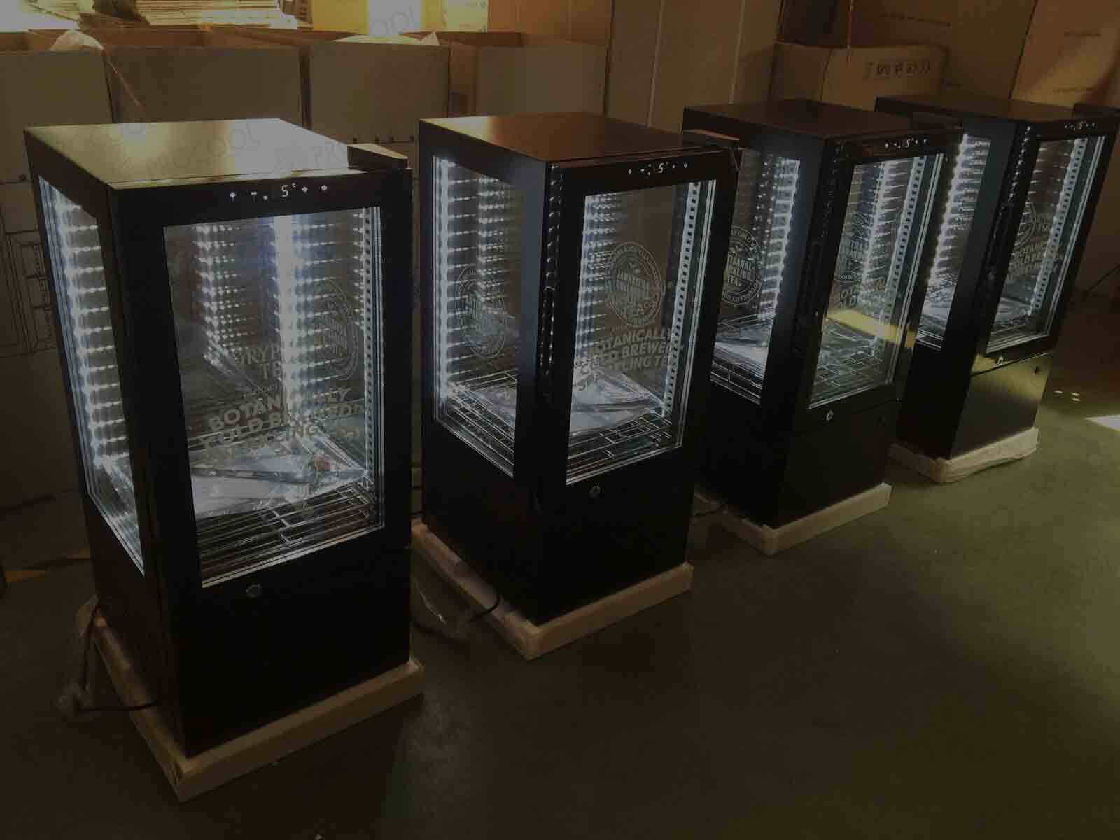 . Nos glacières en verre à 4 côtés sont idéales pour maximiser l’exposition des boissons et des aliments à l’intérieur. Les clients peuvent facilement voir ce qui est animé à l’intérieur sous n’importe quel angle. Nos petits réfrigérateurs refroidisseurs en verre sont construits avec 4 lumières LED lumineuses pour mettre en valeur votre boisson pour plus de ventes impulsives. Il y a aussi fermer à clé sur la porte pour le merchandising pour garder vos marchandises en sécurité dans les magasins. Grâce à nos capacités de fabrication flexibles, la hauteur de ces mini refroidisseurs en verre pourrait être Douane pour s’adapter à différentes dimensions de canettes ou de bouteilles. Si vous recherchez un mini-réfrigérateur en verre de marque avec votre logo pour la promotion, nous pourrions également le faire ensemble dans notre usine, y compris marque d’autocollant et logos gravés sur les lunettes .