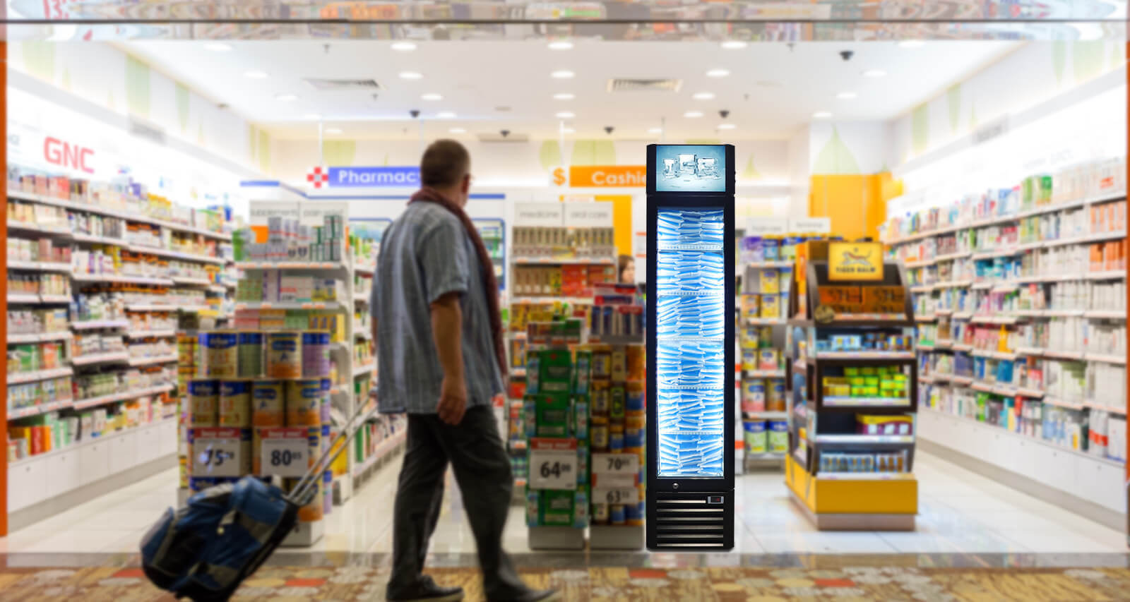 The thin tall shape is perfect for ice bag merchandising in narrow POS and perfectly solve the space problem. The full-length FBI lighting system offers the inside ice bags a bright illumination for display.