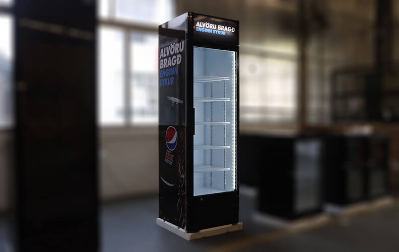Elegant slimline and tall design fit for POS with limited space like groceries, fast-food stores, etc. With or without the advertising lightbox for your choice according to your specific needs. The Various custom fridge stickers with the Pepsi logo or ads can be wrapped on both sides to expand your drink promotion.